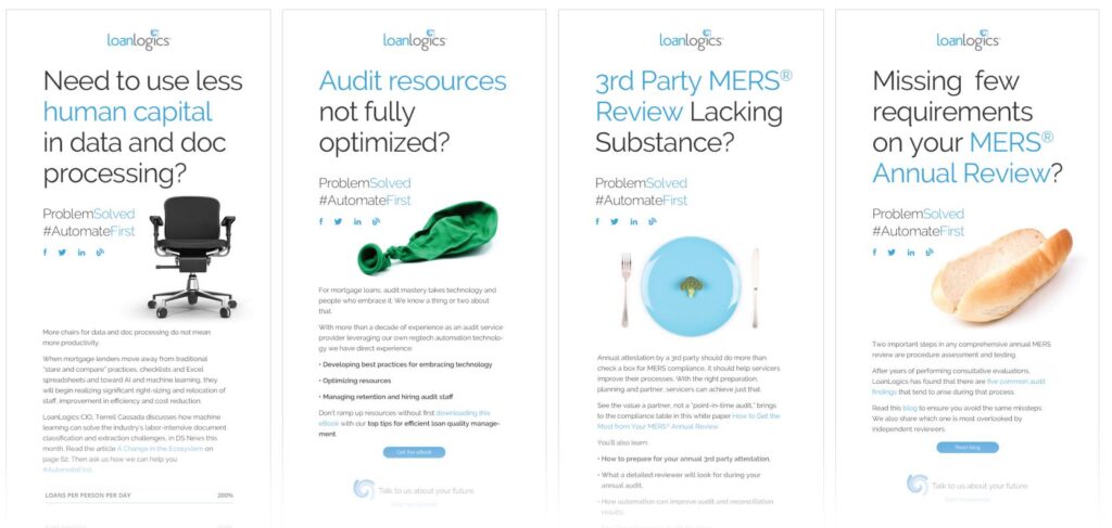 LoanLogics’ marketing team has been recognized by Graphic Design USA for their American Inhouse Design Award for the third time. This year’s winning efforts were for the very cool OurLogics logo design (used by our newly formed diversity, inclusion and equity group & initiative). The other was for the company’s ongoing Problem Solved Email Campaign. If you’re included on our email distribution list of this cross-product campaign, you know it balances eye-catching imagery with thought-provoking questions or statements that challenge the mortgage industry to think about specific problems they may be experiencing and how an Automate First strategy can help solve that.